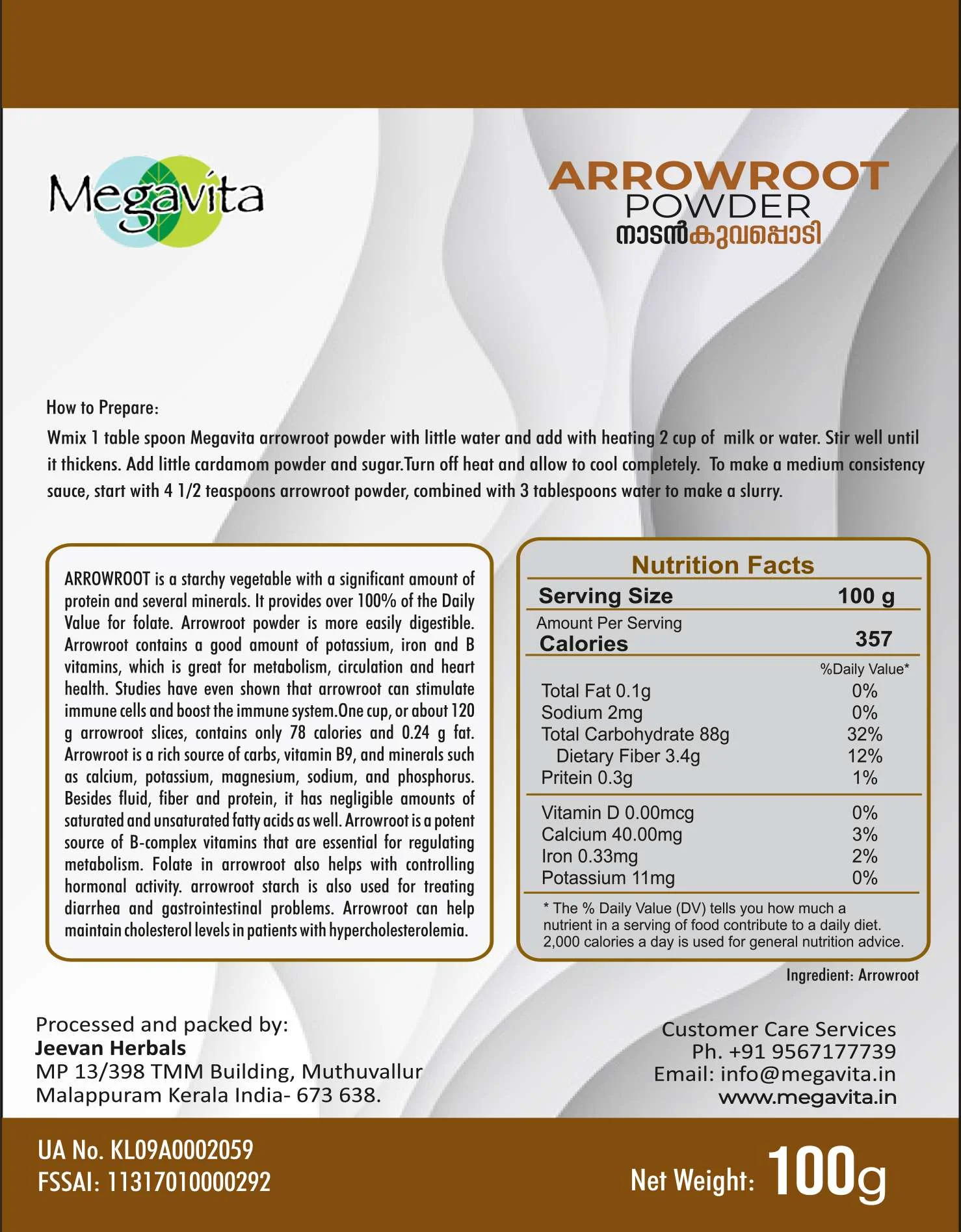 Megavita Arrowroot Powder is a notable source of nutrients and bioactive compounds that not only support growth and development but also increase immunity, promote weight loss, and help control diabetes. Riboflavin, niacin, and folate, which are B-vitamins, are present in Arrowroot Powder. Niacin is particularly effective in increasing good cholesterol (HDL) levels and reducing the risk of heart disease. Carbohydrates, proteins, vitamins, and minerals such as sodium, potassium, calcium, and zinc are also included in this nutritious food